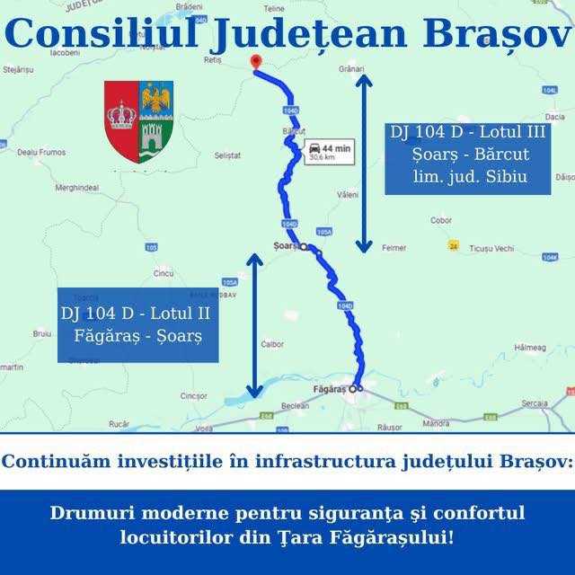 Proiectele noastre de modernizare a două tronsoane din drumul judeţean DJ 104D, respectiv Lotul II Făgăraş – Şoarş, în lungime de 10,085 km, respectiv Lotul III Şoarş – Bărcut – limită de jud. Sibiu, cu o lungime de 15,355 km, continuă pe baza finanţării pe care am asigurat-o din bugetul judeţean.